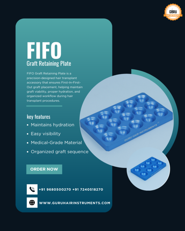 FIFO Graft Retaining Plate is an advanced surgical accessory designed to maintain proper graft sequencing during hair transplant procedures. Built on the First-In-First-Out (FIFO) principle, this plate ensures that grafts extracted first are implanted first, helping preserve graft vitality and improve overall transplant outcomes.