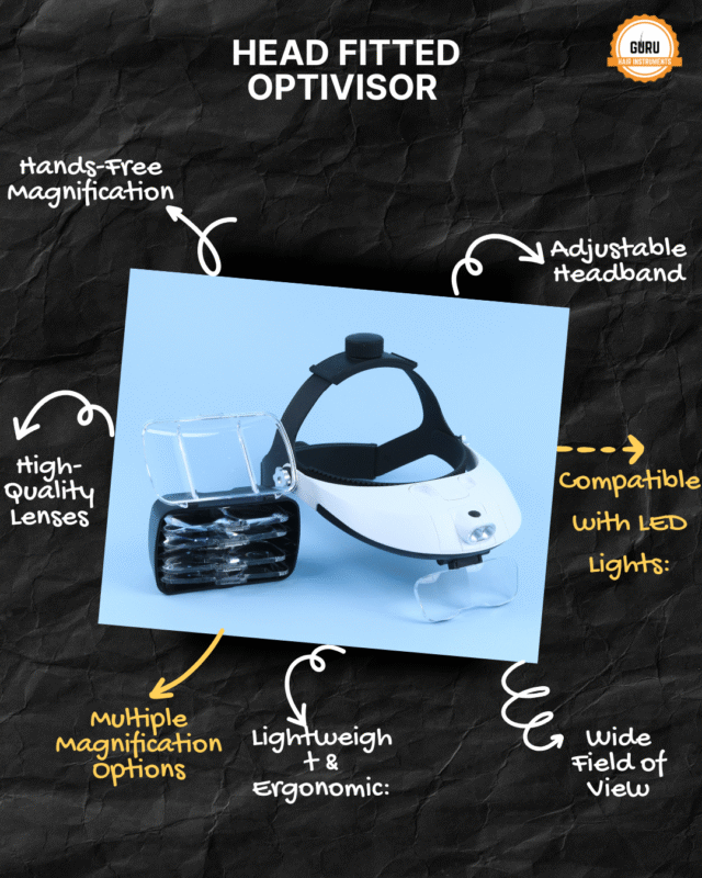 Featuring interchangeable optical lenses, the Optivisor offers magnification levels (e.g., 1.5× up to 3.5×) to suit various surgical steps and surgeon preferences. The ergonomic adjustable headband ensures a secure and comfortable fit, even during long surgical sessions. The visor also tilts out of the way when not needed, adding convenience and flexibility.