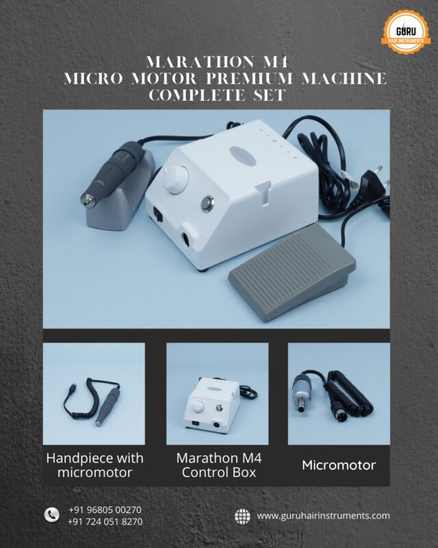 The Marathon M4 Complete Set is built for continuous use, offering durability, safety, and efficiency. Its robust construction and smooth power transmission make it ideal for hair transplant surgeries, nail clinics, dental labs, jewelry work, and other precision applications.