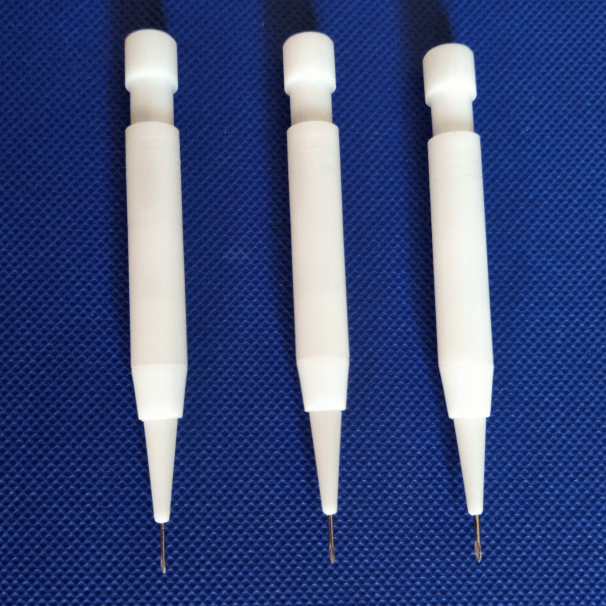 * The Pen Implanter is a pen-like device featuring a hollow needle attached to a tube and plunger apparatus.